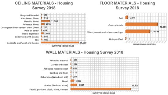 As shown in Figure 6, the principal materials used in Mexican traditional construction systems were determined. For the construction of ceilings, the principal material used is concrete slab or joist and beams slab, with a 70% incidence. The second most popular material for ceilings is metallic sheet with a 16% incidence, followed by wood at 4% [27]. For the construction of floors, the principal material used is concrete slab, at 55% incidence, followed by covering (wood and mosaic) at 53% and pure soil at 3% [27]. For the construction of walls, the principal material used is fabrics (brick, block, stone, and partition) at an 85% incidence, followed by adobe (vernacular technique with mud and straw) at 9% and wood at 5% [27]. The survey results showed that the main construction system used in Mexican buildings is reinforced concrete with an incidence between 55% and 85% for all components). Mexican constructors used local vernacular techniques inherited by their ancestors, like adobe and bahareque (construction technique that uses adobe, straw, bamboo, and metal or fiber cement sheets for walls).