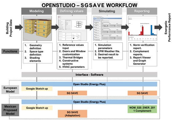 For understating how SGSAVE works, we reviewed the energy performance simulation process in Open Studio [31]. Open Studio is software contained inside the Google Sketch-up interface. The energy simulation process is composed of four principal phases: modeling, definition, simulation, and reporting. For the first phase, the 3D modeling of the evaluated building project, the user works in the Google Sketch-up interface. In this phase, the user establishes the physical values of the building (height, length, width, opening geometry, etc.). For the second phase, the user establishes the parameters and reference values for the modeled building project (materials, construction systems, schedules and calendars, HVAC definitions, space types, etc.). For the third phase, the user defines the simulation parameters before running the simulation engine (run period, desired report results, etc.). The final phase is the report, where the user analyzes the generated simulation report with the corresponding results (verification of the standard, energy demands, etc.). Open Studio functions are delimited from the first to the last phase.