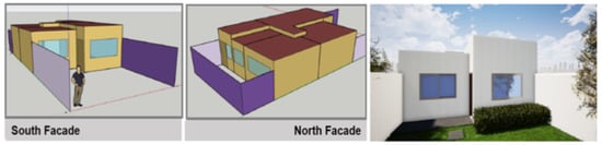 For each component (roof, openings, walls, doors, and shading elements), the software allows the user to assign values, entering the data corresponding to each requested variable, and then the user assigns a construction system for each element. Each construction system was entered into the software, determining the width of each of its composition layers and their respective conductivity coefficients and characteristics, like density and measurement unit. For the last arrangements of the thermal envelope’s geometrical model, the user enters the remaining data needed, like occupation calendar, zone uses (kitchen or bedroom, for example), external shading components, and immediate context elements (trees, roads, location, or other adjacent buildings) [31]. A base model was introduced and configured with Openstudio tools, following the geometry of a typical social housing model, replicated on different Mexican cities (Figure 8).