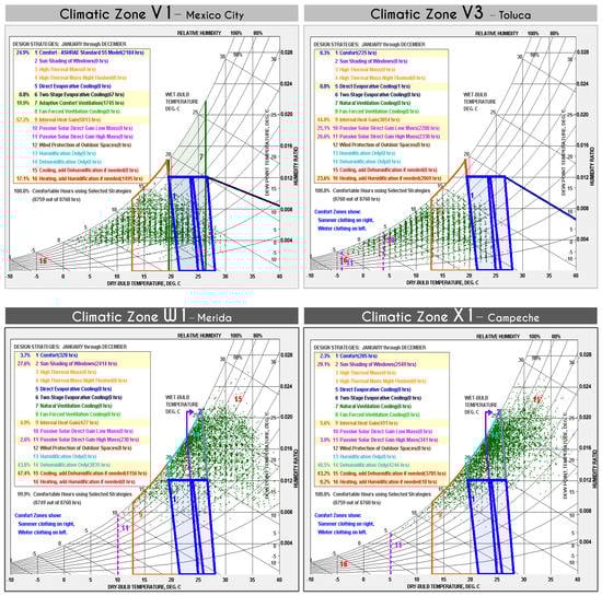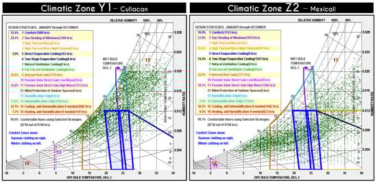 Gumbarevic explained that the main goal of model improvement, is to minimize the heat transfer through the building envelope. For that reason, it is important to pay attention to the design and construction details in all delivery phases—from schematic and design phases up to the construction phase [36]. Because of the poor results obtained with the basic model simulations, the next step was the implementation of bio-climatic strategies for each climatic zone. For choosing the correct bio-climatic strategies, we used weather analysis software Climate Consultant V6 [24]. Using the ASHRAE 55 model for defining thermal comfort parameters, Climate Consultant software generated Givoni’s diagrams for describing the most adjustable bio-climatic strategies for each climate (Figure 9); with the base construction systems, several changes were implemented to construct an improved model that should comply with the Mexican energy standard.(A graphic display of implemented strategies is showed on Figure 10)