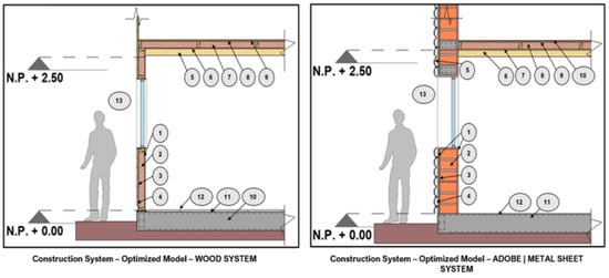 The wood construction system (Figure 11) was composed of 1.8-cm wide Triplay OSB (Oriented Strand Bond) panels and timber structure in the walls and ceiling. The floor was a foundation bed of concrete, with 60 × 60 cm ceramic tile. The walls had a double Triplay OSB panel layer with a wood-cork thermal insulation 5-cm wide with a thermal conductivity of 0.04 W/mK and a vinyl waterproof sheet for stopping condensations [38]. The adobe–metal sheet construction system (Figure 11) was composed of a reinforced concrete structure with walls with adobe blocks (mud and straw regional block). Because of the low bearing capacity of these walls, the model needs a lightweight structure for the ceiling. So, a wood-timber ceiling was proposed, with a floor composed of a foundation bed of concrete slab. The adobe–metal sheet construction is an experimental construction technique, inspired by bahareque vernacular system [39]. The bahareque system is composed of a bamboo frame structure, with a medium-height wall of adobe and a second wall of bamboo panels. The ceiling should be a lightweight structure, like straw or a light wood or bamboo latticework. For this option, the bamboo structure was replaced by a reinforced concrete structure (for seismic resistance), and the walls were covered by a metallic sheet (corrugated galvanized steel), which has high heat reflectance.