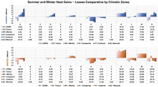 As reported Figure 12, there are different heat gains and losses that should be analyzed. In summer, the largest heat gains of the thermal envelope occur in the external walls, windows through radiating heat gains, air infiltration, ventilation, and internal gains. For winter, the situation for heat losses also occurs for the same channels. These gains and losses can result in larger cooling demands. These results are important because they indicate the critical aspects to consider when optimizing the thermal envelope design. The Mexican standard only reports heat gains through the thermal envelope. However, the verification methods used by other entities, like the European Union, or private certifications, like LEED (Leadership in Energy and Environmental Design), consider energy demands for heating and cooling. Fortunately, Energy Plus also reports the heating and cooling demands for the evaluated project for a simulation period of one year. These are the results obtained, grouped by basic model demands, improved model demands, and energy savings percentages.