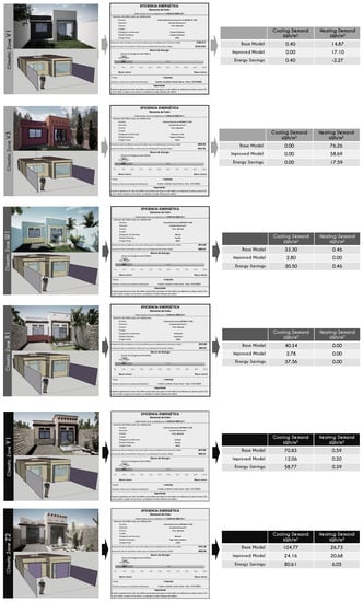 Testing results for the proposed geometric model, Mexican standard certification label, and comparison of heating and cooling demand simulations between the base model and the improved model for Mexican standard certification.