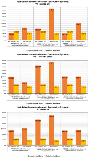 The previous results only apply to the traditional reinforced concrete structure fabric walls system. New simulations were run to test the other two proposed construction systems: wood and adobe–metal sheet. Because the goal of this second testing was to quickly compare the systems, the most extreme climatic zones were chosen: V3, Toluca de Lerdo, for the coolest climate zone; Z2, Mexicali, for the warmest climate zone; and V1, Mexico City, for the temperate climate zone. Before running the simulations, there was a problem of units that needed to be addressed. The Mexican energy standard NOM-020-ENER-2011 reports the heat gains of the thermal envelope in Watts. The Energy Plus engine reports the heat gains of the thermal envelope in kilowatts hour per square meter (kWh/m). For precise comparison, the results of both methods, the complementary simulation report was modified to obtain a wider range of results. For this comparison, two indicators were taken: window total heat loss rate (for radiation heat gains) and surface inside face conduction heat transfer rate (for conductive heat gains). Both indicators are expressed in Watts. The results obtained from the simulations are depicted in Figure 14.