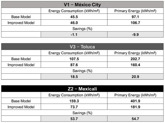 For the V1 (Table 1) cooling demand, the base model needed 0.40 kWh/m, the improved model needed 0 kWh/m, and the savings was 100%. For V1 heating demand, the base model needed 14.87 kWh/m, the improved model needed 17.10 kWh/m, and the savings was –16%. In this case, the V1 model meets the Mexican standards, but the improved model resulted in larger heating demands due to thermal insulation. For V3 (Table 1) cooling demand, the base model needed 0 kWh/m, the improved model needed 0 kWh/m, and the savings was 0%, because there was no cooling demand due to the effectiveness of the thermal envelope. For V3 heating demand, the base model needed 76.26 kWh/m, the improved model needed 58.69 kWh/m, and the savings was 23%. As shown, the energy savings are similar in both the Mexican standard and in the heating/cooling demands.