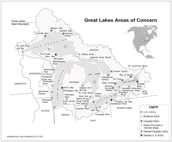 In 1985, an ecosystem-based model of management was introduced into the Laurentian Great Lakes under the auspices of the Canada-U.S. Great Lakes Water Quality Agreement (GLWQA). This agreement requires that collaboratively generated Remedial Action Plans (RAPs) in 43 historically polluted Areas of Concern (AOCs) (Figure 1) be developed and implemented using an ecosystem approach to restore impaired human and non-human Great Lakes uses, which are formally referred to as beneficial uses [3,10]. Annex 1 in the GLWQA outlines the 14 different beneficial use impairments (BUIs), which are caused by reductions in the chemical, physical, or biological integrity of the waters of the Great Lakes [3,10].