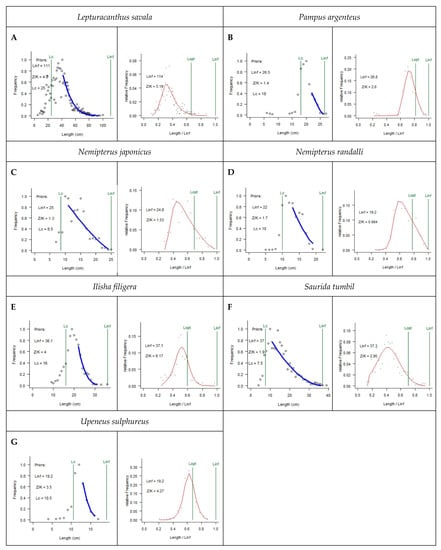 Graphical findings (A–G) of LBB method for the seven commercially harvested marine fishes from the Bay of Bengal (BoB), Bangladesh. Lc is the length at first capture, Linf is the limit body length of this species, and Lopt denotes the length at which the maximum sustainable catch is obtained.