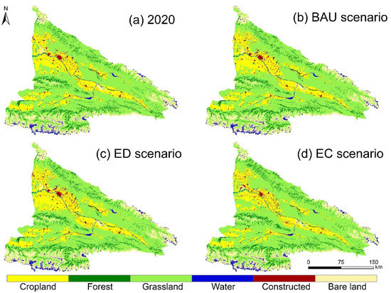 Land-use maps for 2020–2030 generated by the PLUS model for each of the different scenarios. (a) 2020, (b) BAU scenario, (c) ED scenario, (d) EC scenario.