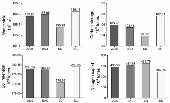 The analyses indicate that there were rapid expansions of both cropland and construction land in the ED scenario. In many studies, an increase in cultivated and construction lands is mainly caused by the conversion of forests and grassland, which is consistent with the findings of this study [23,55,56]. In the ED scenario, a large amount of forested grassland was cleared, resulting in a significant decline in ESs (Figure 5). If economic development policies are implemented in this situation, the ecological recovery is slower and with smaller patches [57,58,59].