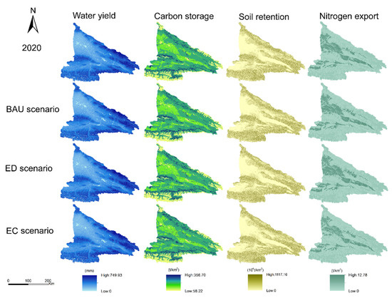 Spatial distributions of regulating service indicators (water yield, carbon storage, soil retention, and nitrogen export) in the Yili River Valley from 2020 to 2030 for each of the scenarios.
