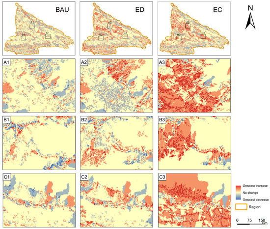 Spatial patterns of multiple interactions among the ESs in each of the scenarios from 2020 and 2030. (A1–A3) are the ES changes for the BAU, ED and EC scenarios in region A. (B1–B3) are the ES changes for the BAU, ED and EC scenarios in region B. (C1–C3) are the ES changes for the BAU, ED and EC scenarios in region C.