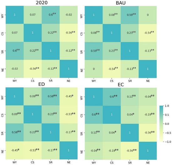 Correlation analysis between the ESs indicator pairs for each of the scenarios in the Yili River Valley. The significance level is denoted by stars on the upper right side of each correlation coefficient (No * means p 0.05; * means p 0.05; ** means p 0.01).