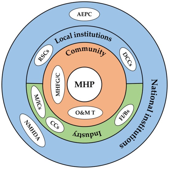 Industry: Within industry, there are technical and financial stakeholders. Consulting companies (CCs) are responsible for conducting feasibility studies, sizing the overall scheme, specifying key components and designing the civil structures [13]. Manufacturing and installer companies (M/ICs) produce or procure the required hydro-mechanical and electrical equipment. In Nepal, it is common for companies to perform all three of the technical services of consultation, manufacturing and installation. Private finance institutions and banks provide credit to local communities to pay for project costs that are not covered by the subsidy [36].
