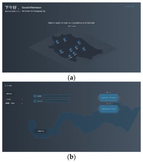 Figure 4 shows a screenshot of the web-based visualization application. On the log-in page (Figure 4a), the user can first select a district of Chongqing. Then, the population synthesis task could be established, or the existing population realizations could be retrieved (Figure 4b). The visualization in Figure 4c shows a 3D plot of the buildings and the heatmap of the synthetic residential population generated in the analytical module. The map allows users to explore the population distribution in 2D or 3D, with or without a heatmap. It also allows the selection by clicking on a neighborhood from the list on the right or drawing a rectangular area using a mouse. The aggregated statistics and distributions of population attributes of the selected buildings, neighborhoods, or mouse drawn rectangular areas are displayed in columns and radar charts labeled as 3 and 4. This provides a chance to comprehend and compare the spatial differentiability of population distributions at different spatial levels.