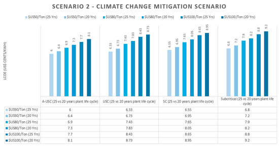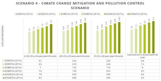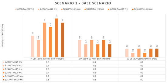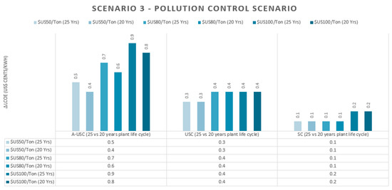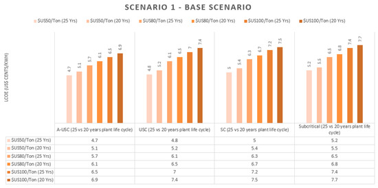 The WCA report [4] confirms that advanced coal technologies have a slightly higher LCOE compared to subcritical coal due to the initial higher capital costs. In contrast, results obtained in our work suggest that HELE technologies are economically competitive against subcritical plants. Since the WCA study does not cover details of LCOE calculations, methodology, data, and assumptions, the LCOE results for coal technologies in our work are not directly comparable to the WCA’s LCOE results for coal technologies. In our work, a sensitivity analysis was carried out to evaluate the impact of different coal prices for 1000 MW-capacity coal-fired plants with life spans of 20 and 25 years and relies on IEA-listed thermal efficiencies for both technologies under different potential scenarios from ERIA’s study in [23]. Therefore, our work in this paper is also not comparable with the ERIA study in [23]. Both the WCA and ERIA studies do not include an economic feasibility study of A-USC for the Southeast Asia region. In contrast, in our work, A-USC emerges as the most economically attractive choice, followed by USC and SC for the region.