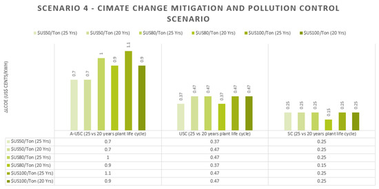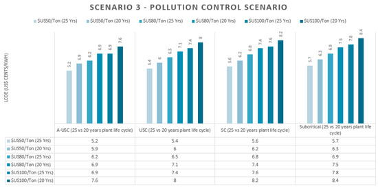 The cost of coal-fired electricity generation is heavily contingent on coal price. Since the Asian benchmark of thermal coal prices has been growing, based on (2), sensitivity of LCOE generation values is thus analyzed to evaluate the impact of rising coal prices in Southeast Asia on subcritical, SC, USC and A-USC coal-fired units with life spans of 20 and 25 years, under each scenario.
