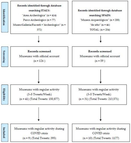 As in most fields, digital technology has had a major impact on archeology, and recent studies have taken into account technology management [43], as well as how institutions using this technology communicate and educate through social networks [11]. This latter study constitutes a precedent in its analysis of educommunication carried out on Twitter by Spanish archeology museums during COVID-19 (coronavirus disease); however, Italian museums have always been at the forefront of a systematic review of the literature on this topic [3,22,24]. For this reason, this study was expanded to compare these educommunicative strategies.