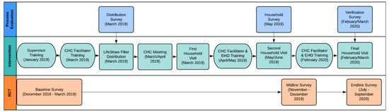 Given the WASH focus of Gikuriro, this program was selected to apply the integrated approach—household water filters and CHCs—while running a concurrent study to determine the effectiveness of this integration. In short, distribution of the filter and support of its use was to be incorporated into the ongoing Gikuriro activities that were focused on WASH education through CHCs, with an RCT and process evaluation to be run in parallel. The RCT was carried out from December 2018 through September 2020; the process evaluation took place from February 2019 through May 2020. Together, the RCT and process evaluation will be referred to as the study.