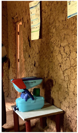 The Vestergaard Frandsen LifeStraw Family 2.0 household water filter in an intervention household, with instructions and health behavior messaging included on wall posters.
