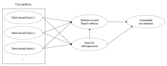 The U&G theory assumes that factors such as an individual’s psychological conditions, motives, and social circumstances influence his/her media use and affect his/her acceptance of media content [15]. However, no single factor to mainly drive the users’ media use has been theorized [16]. Rather, it is suggested that the interaction between user motives and psychological traits predict his/her media use behavior [16,17]. In this study, we focus on psychological predictors like need for self-expression as one of the intrinsic traits of consumers involved in the use of brand webtoons.