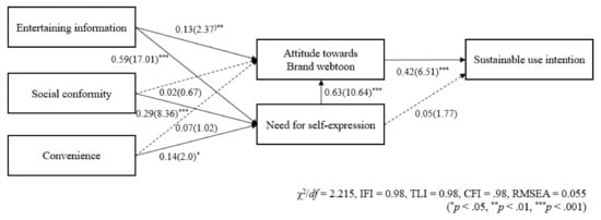 Finally, H5 deals with the causal relationships between webtoon users’ need for self-expression and their continuous use intention. Unexpectedly, need for self-expression was not significantly related to the users’ intention to use brand webtoons. Therefore, H5 is not supported (see Table 4). We further examined the mediating effect of consumers’ attitude towards brand webtoons on the relationships between their need for self-expression and sustainable use intention for brand webtoons. To this end, it was confirmed that need for self-expression had a direct and significantly positive effect on the webtoon users’ intention to continuously consume the webtoons. As shown in Figure 3, the results indicate a full mediating effect of the webtoon attitude that the higher consumers’ need for self-expression, the more they show more favorable attitude towards brand webtoons, which in turn positively affects their sustainable use intention for the brand webtoons. The final effect model is presented in Figure 3 (path coefficients are standardized values and t-values are mentioned in parentheses).