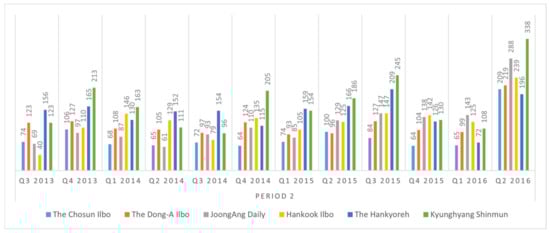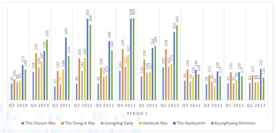 Figure 1 presents the quarterly distribution of EU-related articles in South Korean major newspapers during Period 1. Here, Q1 means the months January to March, Q2 means April to June, Q3 means July to September, and Q4 means October to December. The peak time periods in Figure 1 were Q2 and Q4 in 2011. In Q2 2011, the EU-Korea FTA was provisionally applied, and this might have led to the increase in the number of EU-related news articles. In Q4 2011, the debt crises of Italy and Spain presented the main agenda of our data set; therefore, Europe’s debt crisis and the accompanying fear about the possible impact on the South Korean economy was the possible trigger point of the sudden increase in the number of EU-related news items. These trigger points imply that South Korean newspapers and their readers would have expectations of the EU in terms of increasing their national wealth by access to the biggest market in the world.