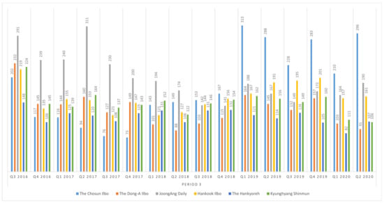 Figure 3 presents the quarterly distribution of EU-related articles during Period 3. Based on the average number of articles produced, there are two peak points (Q3 2016 and Q1 2019) needing further explanation. Following on from the previous period, the third quarter of 2016 witnessed the news media covering the possible impacts of Brexit on South Korea and its economy and trade with the EU and the UK. During the first quarter of 2019, the EU and UK conducted successful negotiations regarding the UK’s exit from the EU on 29 March 2019, two years after triggering Article 50 of the Lisbon Treaty (the legal mechanism for EU member states to leave the European Union).