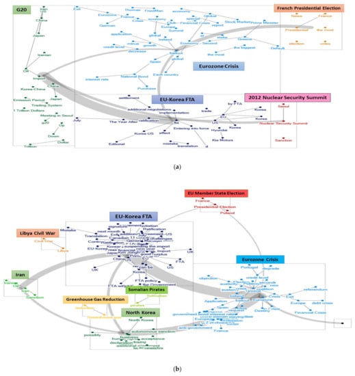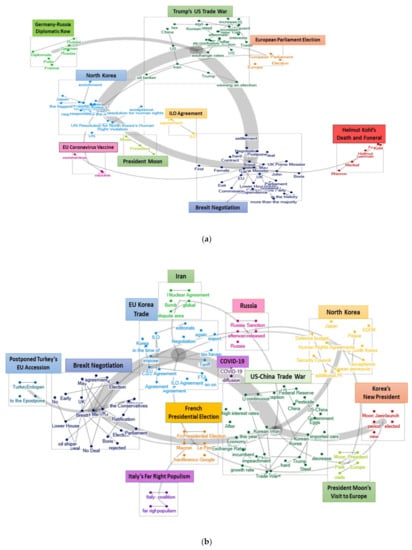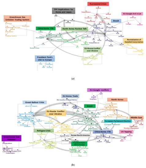 For an analytic model, Semetko and Valkenburg suggested five experimental framing conditions based on the empirical studies on framings: conflict frame, human interest frame, economic consequences frame, morality frame, and responsibility frame [14]. First, a conflict frame is caused when there is an emphasis on conflict between opponents and proponents in attaining the interest of the audiences [14]. Examples of this form include presidential elections [50] or inducing public mistrust of political leaders [52]. The human interest frame refers to “an effort to personalise, dramatise, or emotionalise the news, in order to capture and retain audience interests” [14] (p. 96). The economic consequences frame results from the main story in news articles making the public think about their economic consequences [14]. Neuman et al. suggest this framing is the most common one in news media [52]. For instance, the news media release news items about the economic impact of global issues in the society where the audience is located. The morality frame reports issues or problems “in the context of […] moral prescriptions” [14] (p. 96). The media uses this framing device to address sensitive social issues by asking questions or leaving the agenda to the audience. Due to issues of objectivity, journalists use references to establish morality frames [41], which seem to have an impact as they influence the social norms embedded in the minds of the audience. Finally, the responsibility frame occurs when someone makes other individuals or groups (who are responsible for the cause) a solution for certain issues (usually social problems) [14]. Examples can be found from Iyengar’s study on television news, in which the audience are induced or encouraged to individually answer questions about social problems such as poverty [53]. Based on Semetko and Valkenburg’s experimental framings, this study explores the relevant framings embedded in semantic network mapping to decipher inherent meaning. Since the text is unstructured data, the interpretation of the data collected, extracted, and analysed seems to be essential. To avoid the ad hoc interpretation of the data, this study employs media frames that determine their preliminary arrangements. Subsequently, we approach which types of media framings were salient in the EU coverage in the Korean news media. For instance, when Korean media were inclined to project conflict frames in covering EU affairs, we can interpret that the Korean media tend to show the negative perceptions of the EU. We can also explore the Korean media’s motivation to cover negative issues about the EU by looking at the issues attached to the conflict frames.