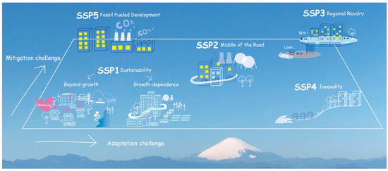 SSP3 is a scenario of regional rivalry, international fragmentation, and reversal of globalization trends [14]. In Japan, the theme of SSP3 is social division, with strong migration to urban areas and decline of rural areas, where many communities disappear [17]. Technology advancement is delayed, resulting in declined competitiveness and economic stagnation. Challenges are high in both mitigation and adaptation.