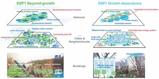 Based on the nature-based solutions and traditional considerations above, we developed SSP1 along two alternative pathways: ‘Growth-dependence’, and ‘Beyond-growth’. Growth-dependent society focuses on economy-driven sustainability with intensive upgrades of high technologies and large-scale infrastructures. In contrast, ‘Beyond-growth’ focuses on the local/community based circular economy with sufficient green infrastructures. These concepts are theoretically investigated within the Tokyo SSP scenarios as ‘efficiency scenario’ and ‘happiness scenario’ [18]. The efficiency scenario required the successive upgrade of new technologies and infrastructures to achieve the maximum efficiency, while the happiness scenario focused on the local assets, human capitals, and well-being with quality amenity spaces for maximizing the social equity. The scope of the efficiency and happiness factors are extended in this paper and put in the context of a growth-dependence and beyond-growth interpretation of sustainability. An overview of the scenario assumptions and their visual representation using pattern language are reported respectively in Table 1 and Figure 1.