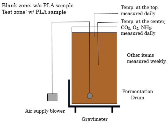The test zone contained the PLA sample, whereas the blank zone did not. Table 1 shows the compost raw materials. The PLA sample was a PLA film-laminated paper plate cut into 5 × 5 cm2 pieces. Table 4 shows the conditions.
