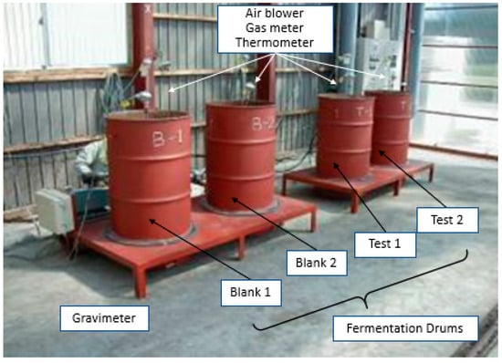 Each fermenter was a 180 L metal columnar drum (without a stirring mechanism) equipped with a blower with an airflow meter, non-dispersive infrared absorption (NDIR)-type CO2 concentration meter, thermometer, and other measurement equipment (Figure 3). Table 2 summarizes the list of auxiliary apparatus.