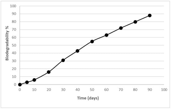 Tracing the biodegradability of PLA powder using the amount of CO2 generated in the mature compost confirmed that about 88% of the PLA decomposed in 90 days (Figure 6).