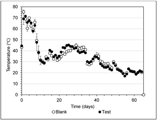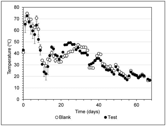 The temperature during the test period was measured at the top (Figure 7) and center of the fermenter (Figure 8). The blank and test zones did not differ significantly as both showed a temperature of 65 °C or higher for a minimum of 48 h at the early stage of fermentation. Hence, the compost meets the test standards of ISO 16929 and the epidemiological conditions of Japan.