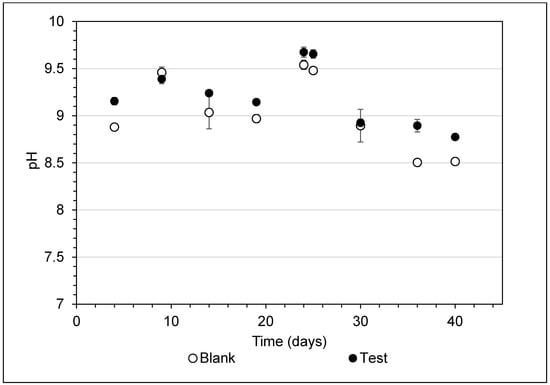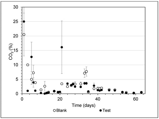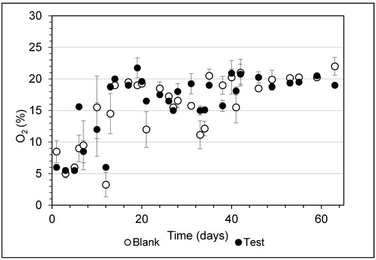Figure 9 shows the daily change in CO2 content in both the blank and test conditions. The content initially increased, but then decreased rapidly. From 10–50 days, the content was 0–5%, but it settled at around 1% or less after 50 days. There are some points that do not overlap in the data of the blank zone and the test zone, but when comparing the behavior before and after, there is no significant difference between the two zones.