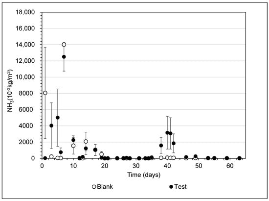 The NH3 concentration in the fermenter was initially high but decreased after 20 days (Figure 11). The data from the large error bar at around the 40 day mark may appear irregular, but when comparing it to the decomposition behavior of the two zones at other periods, there were no significant differences.