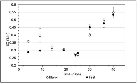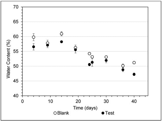 The test (treated) and blank (untreated) zones did not significantly differ with regard to water content, pH, EC, and residual amount of ignition during the test period (Figure 12, Figure 13, Figure 14 and Figure 15).