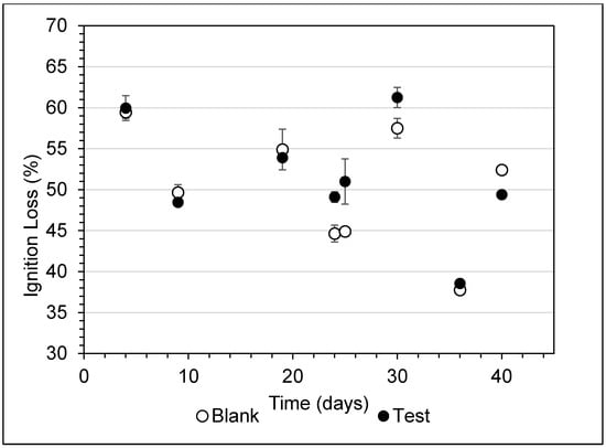 ISO 14855 tracks the biodegradability by the amount of CO2 generated [10]. On the other hand, this study used ISO 16929, which assesses the contents of the fermenter after testing and sieving [10]. The decomposition rate was subsequently calculated by comparing the dry weight of the remaining PLA sample and the original PLA sample. Such a comparison is challenging. Here, if degradation is considered to be complete at the time when the temperature, CO2 concentration, and weight in the container stopped changing, it means that 94.8% of the PLA sample was degraded in 50–60 days. Comparing the above results in laboratory-scale and pilot-scale studies, the degradability on the laboratory scale and the pilot scale was at least equivalent when considering the sample shape, and suggest a slightly faster degradation time on the pilot scale.