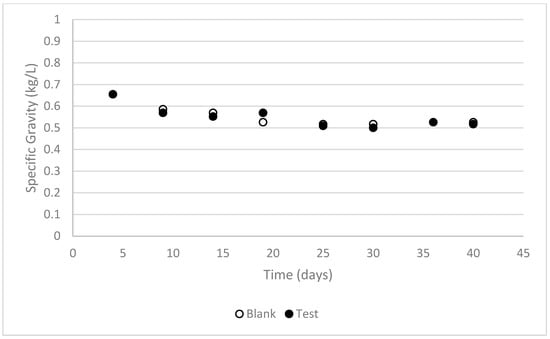 Figure 16 and Figure 17 show the weight per container and bulk specific gravity measured during the test period, respectively. The test and blank zones showed similar results. These results further demonstrate that the presence of PLA film-laminated paper did not affect the composting process.