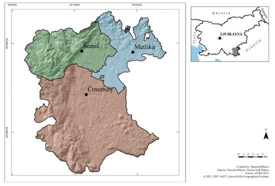 Geographical location of the study region and its three municipalities (Črnomelj, Metlika and Semič).
