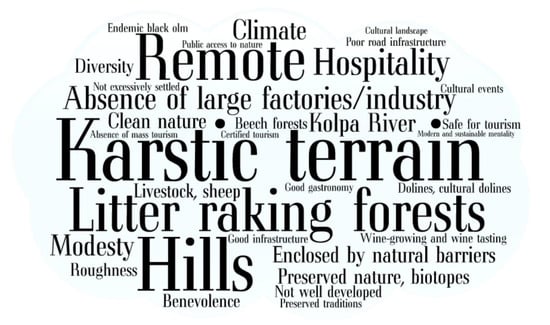 Responses to all questions from the interviews conducted by the five stakeholder groups (farmers, resident non-farmers, nature protection professionals, tourism professionals, local government representatives) were analysed individually. Figure 2 provides the coded answers to the question number 4 (Table 1), “What are the characteristics of this landscape that distinguish this place from other landscapes?”. More frequently mentioned special characteristics of landscapes in Bela krajina were “Karstic terrain”, “Litter raking forests” and “Absence of large factories/industry”. One might think that when respondents mentioned features of their landscape such as “Remote”, “Absence of large factories/industry”, “Absence of mass tourism” and “Not well developed”, these were meant as negative aspects, however, these were actually expressed as positive features of their landscape. The majority of respondents answered that the region benefits from being less developed, as this protects the natural areas from being destroyed for development.