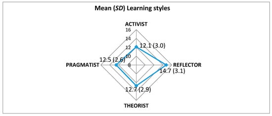 With respect to the way in which students’ learning styles develop over the course of their studies [39], the research findings show that the most frequent style at the outset is the Activist, whilst at the end the Reflector and Pragmatist predominate. Elsewhere, similar results were found in terms of the preferred style—the Activist—at the beginning of students’ degree courses, but this case found the Theorist was predominant by the end [40]. The authors account for this finding by suggesting that as the university students progress through their courses, they recognise a growing need to complement the active and experiential models with more theoretical foundations.