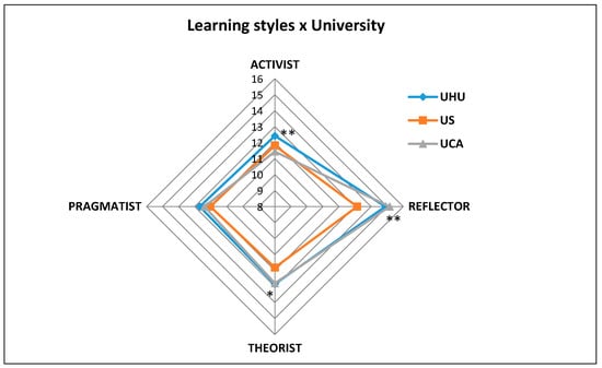 Learning styles preferences by university. ** p < 0.01 * p < 0.05.