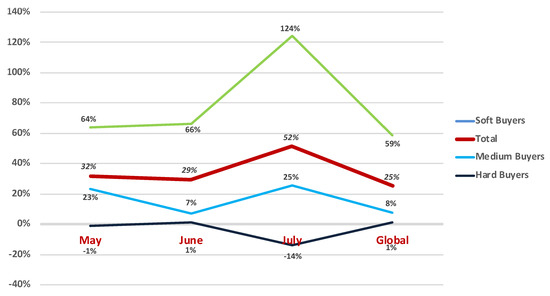According to the data obtained, using a one-sample t-test procedure, we could see that the impact of the intervention in terms of improving the variety of articles purchased was especially high among the Soft Buyers, with a Global increase of 62%, t(1156) = 14.902, p = 0.000. The Soft Buyers were followed by the Medium Buyers, by a significant amount, because the Global increase was only of 11%, t(829) = 4.091, p = 0.000, which was also very similar to the Hard Buyers, which had an increase of 8%, t(968) = 4.572, p = 0.000. Overall, the increase in the variety of articles purchased during the period of the intervention was 30%, t(2995) = 15.455, p = 0.000. In terms of months, the impact was higher during the month of July for all the segments, with the exception of the Hard Buyers.