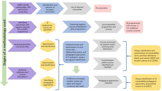 In the following section, we represent our methodology for selecting and evaluating sustainability-oriented courses and topics within them. The methodology consists of several stages, e.g., universities’ selection procedures, identification of logistics-oriented programmes, analysis of course titles and syllabuses, classification and systemisation, and classification of existing pedagogical approaches within the identified courses. We explain the overall methodology in
