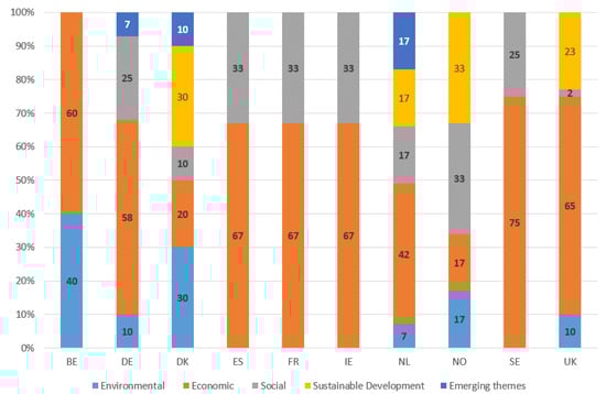 Thus, we diversified the sustainability-oriented courses from two perspectives: systemic and topical. We listed identified courses within five systemic levels, comprising principle, approach, sub-system, system, and sustainability. We differentiated the recognised courses within five theme clusters regarding the topics covered, corresponding to horizontal sustainability dimensions: environmental, economic, and social. We added two additional topical dimensions—“sustainable development” to cover complex sustainability topics, which are general, interdisciplinary, and multi-dimensional (e.g., introduction to sustainable development), and “emerging themes,” where we examined new research and educational fields, such as sustainable consumption and production, smart cities, smart specialisation, circular economy, innovations in logistics, etc. We examined the emerging themes to elaborate on the educational programmes’ flexibility and courses if following up with the existing research novelty and trends. We also carried out a distribution of the courses between European countries to identify their higher education systems’ directions.