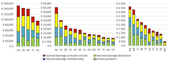 The added value of agriculture in the agri-food chain (in million euros among EU countries). Source: CAP Specific Objectives explained—Brief No. 3 Farmer Position in the Value Chains. European Commission Agriculture and Rural Development.