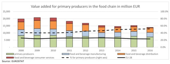 Value added for primary producers in the food chain in Greece (million EUR). Source: CAP Specific Objectives explained—Brief No 3 Farmer Position in the Value Chains. European Commission Agriculture and Rural Development.