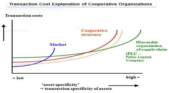 In terms of transaction cost theory, the existence of marketing cooperatives in the agricultural sector can be explained on the basis of the “contract costs” for the marketing of agricultural products. The producer has difficulties in exploring market opportunities alone. The marketing cooperative is a type of hybrid organization that operates in the market. Hybrids are non-standard modes of organization in which the partners pool strategic decision rights and some property rights (frequently substantial) while simultaneously keeping distinct ownership over key assets (they jointly develop new assets without merging together). As shown in Figure 4, markets are characterized by assets with increased transaction specificity. Hybrid organizations (such as marketing cooperatives) are more efficient than (spot) markets. In cases where transaction specificity of assets is very high, hierarchical forms of coordinating the supply chain are most efficient.