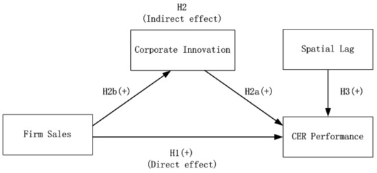 There is a mediating effect between sales and CSR [4]. In addition, corporate innovation plays a mediating role in the relationship between CER and firm value [28]. Corporate innovation is considered as a cumulative and dynamic knowledge system that leads to the transfer and diffusion of ideas, knowledge, learning, and economic development [49,50]. As a mediating variable, corporate innovation acts as the “transformation engine” between sales and CER performance. To realize this function, two connections are needed: